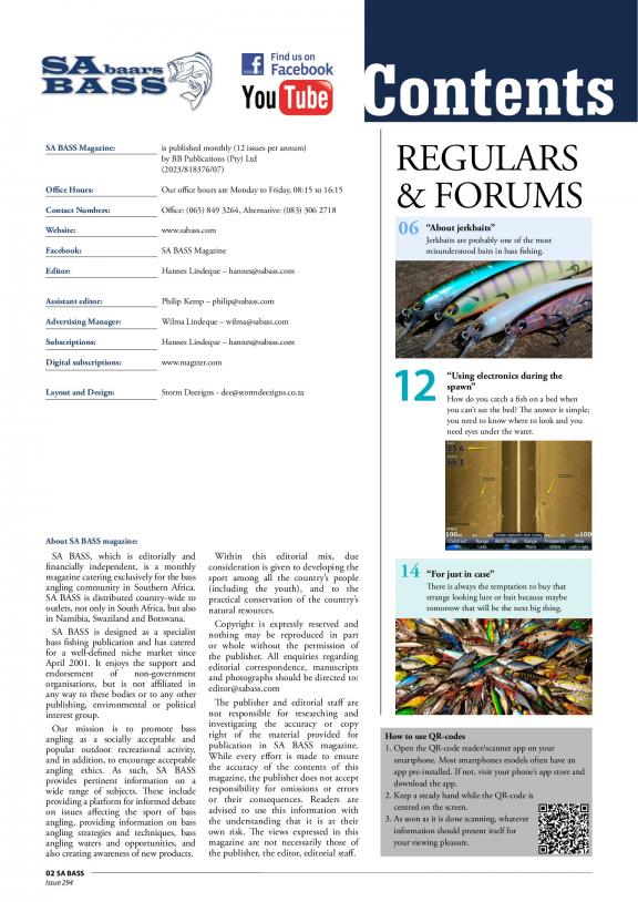 SA BASS, which is editorially and financially independent, is a monthly magazine catering exclusively for the bass angling community in Southern Africa. It is designed as a specialist bass fishing publication and has catered for a well-defined niche market since April 2001. It enjoys the support and endorsement of non-government organisations, but is not affiliated in any way to these bodies or to any other publishing, environmental or political interest group. SA Bass is a specialist publication, providing authoritative editorial exclusively on bass angling and related subjects such as boats, conservation and outdoor recreation vehicles. Articles are compiled by its own staff backed by a team of experienced bass anglers appointed as SA Bass Field Representatives throughout the country and overseas. Our mission is to promote bass angling as a socially acceptable and popular outdoor recreational activity, and in addition, to encourage acceptable angling ethics. As such, SA BASS provides pertinent information on a wide range of subjects. These include providing a platform for informed debate on issues affecting the sport of bass angling, providing information on bass angling strategies and techniques, bass angling waters and opportunities, and also creating awareness of new products. Within this editorial mix, due consideration is given to developing the sport among all the country's people (including the youth), and to the practical conservation of the country's natural resources. SA Bass is a key role player on behalf of bass anglers and the bass industry in negotiations with the Department of Environment Affairs and Tourism regarding regulations of the Biodiversity Act that regulate the presence of Bass in the country. SA Bass is the official organiser and presenter of a monthly bass angling tournament, known as the “Cast-for-Cash” Tournament Trail that provides an opportunity for recreational as well as experienced, top-level bass anglers to compete for prize money and trophies. To maintain and enhance the value of the publication, SA Bass presents its readers with regular reader competitions with prizes provided by many sponsors and advertisers. SA BASS is distributed country-wide to outlets, not only in South Africa, but also in Namibia, Swaziland and Botswana. Copyright is expressly reserved and nothing may be reproduced in part or whole without the permission of the publisher. Website: www.sabass.com.