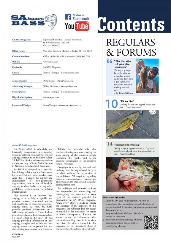SA BASS, which is editorially and financially independent, is a monthly magazine catering exclusively for the bass angling community in Southern Africa. It is designed as a specialist bass fishing publication and has catered for a well-defined niche market since April 2001. It enjoys the support and endorsement of non-government organisations, but is not affiliated in any way to these bodies or to any other publishing, environmental or political interest group. SA Bass is a specialist publication, providing authoritative editorial exclusively on bass angling and related subjects such as boats, conservation and outdoor recreation vehicles. Articles are compiled by its own staff backed by a team of experienced bass anglers appointed as SA Bass Field Representatives throughout the country and overseas. Our mission is to promote bass angling as a socially acceptable and popular outdoor recreational activity, and in addition, to encourage acceptable angling ethics. As such, SA BASS provides pertinent information on a wide range of subjects. These include providing a platform for informed debate on issues affecting the sport of bass angling, providing information on bass angling strategies and techniques, bass angling waters and opportunities, and also creating awareness of new products. Within this editorial mix, due consideration is given to developing the sport among all the country's people (including the youth), and to the practical conservation of the country's natural resources. SA Bass is a key role player on behalf of bass anglers and the bass industry in negotiations with the Department of Environment Affairs and Tourism regarding regulations of the Biodiversity Act that regulate the presence of Bass in the country. SA Bass is the official organiser and presenter of a monthly bass angling tournament, known as the “Cast-for-Cash” Tournament Trail that provides an opportunity for recreational as well as experienced, top-level bass anglers to compete for prize money and trophies. To maintain and enhance the value of the publication, SA Bass presents its readers with regular reader competitions with prizes provided by many sponsors and advertisers. SA BASS is distributed country-wide to outlets, not only in South Africa, but also in Namibia, Swaziland and Botswana. Copyright is expressly reserved and nothing may be reproduced in part or whole without the permission of the publisher. Website: www.sabass.com.