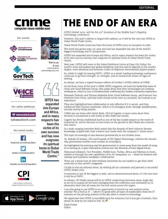 For any serious IT player in the Middle East, there are key market sectors that are easy to list – government, energy, banking, education, health, hospitality and so on. One key question is how do you use your marketing spend effectively to reach and influence the key decision makers in these markets? Plan and influence their strategies? For two decades, Computer News Middle East (CNME) has been the link between the regional IT player and these key target markets. It has driven the messages of local relevance, business benefit and technology into focus for these decision makers. The magazine covers all the important market sectors in depth, combining interviews, best practice case studies, news analysis and market trends through focused sections. Add to this analysis of global news, exclusive interviews with global IT players from Silicon Valley to Taipei and you have an authoritative route to market.