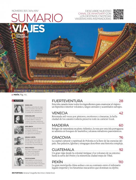 Los reportajes de la revista Viajes National Geographic España es el medio idóneo para admirar la belleza del mundo, inspirarse o relajarse con ella, evocar antiguos viajes o plantearse otros nuevos. Con fotografías y textos de calidad excepcional, Viajes National Geographic presenta cada mes rutas por España, Europa y el resto del mundo, escapadas de fin de semana y paseos para conocer lo más atractivo de una ciudad, junto a experiencias en plena naturaleza o para disfrutar del patrimonio cultural.