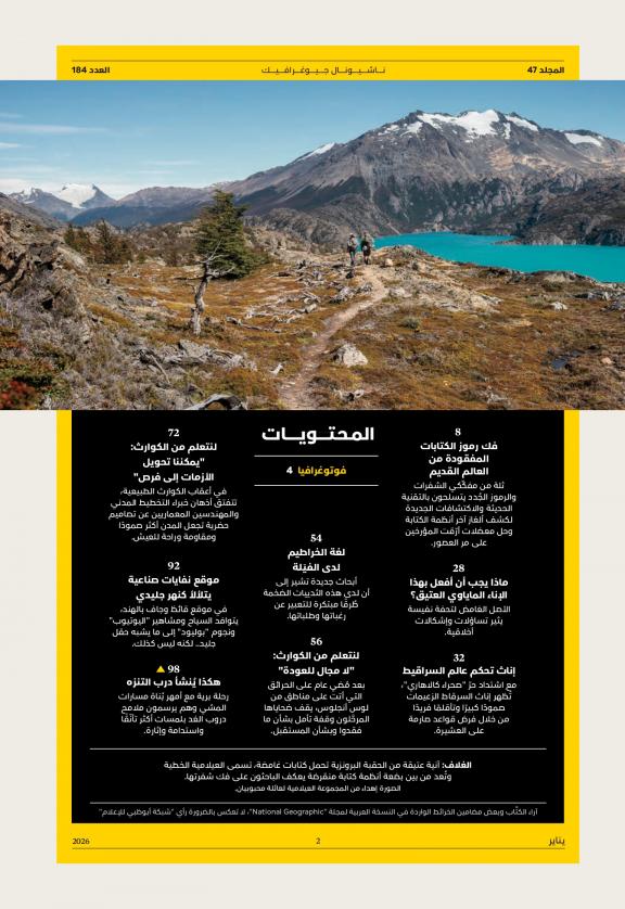 بعد النجاح المدوي لمجلة ناشيونال جيوغرافيك ماغازين، دخلت الجمعية الجغرافية الوطنية غمار الترخيص بطبع نسخ عالمية من المجلة بلغات بلدان مختلفة. ومع توالي النجاحات في هذا المنحى، أصبح عدد الطبعات العالمية يفوق الثلاثين، كلها متشحة بلون الذهب وهي تتفيأ بظلال الإطار الشهير لناشيونال جيوغرافيك. ثم آن أوان الحدث الذي ظل عشاق المعرفة عبر العالم العربي ينتظرونه مدة عقود من الزمن: ناشيونال جيوغرافيك بلغة المتنبي والجاحظ. وكانت الانطلاقة في أكتوبر 2010 من أبوظبي حيث نشأت وازدهرت كبريات المؤسسات الإعلامية على الصعيد العالمي، وفي مقدمتها “أبوظبي للإعلام” التي تصدر مجلة “ناشيونال جيوغرافيك العربية”. منذ أول عدد من المجلة، أخذ طاقمها على عاتقه انتقاء أجود الموضوعات وأكثرها رصانة من أجل تقديم أشهى الأطباق المعرفية إلى القارئ العربي المتعطش لاكتشاف ما ينطوي عليه كوكب الأرض من أسرار. ولئن كان جل المواد المنشورة في المجلة العربية عبارة عن ترجمات من ناشيونال جيوغرافيك ماغازين، فإن الموضوعات التي تتطرق إلى المنطقة العربية- بأقلام وعدسات عربية- تجد لها حيزا خاصا بين صفحات المجلة في كل عدد. وعلى خطى المجلة الأم، ما انفكت ناشيونال جيوغرافيك العربية تستقطب خيرة المستكشفين والمصورين الفوتوغرافيين العرب من أجل كشف الحجاب عن الكنوز الطبيعية التي يزخر بها الوطن العربي براً وبحرا. كما تستنير المجلة بمشكاة هيئة علمية استشارية تضم ألمع الخبراء والعلماء العرب على الصعيد العالمي. بعد أن أنارت سماء الإعلام العربي وأضافت زخما جديدا للمطبوعات العلمية النادرة بلغة الضاد، تواصل ناشيونال جيوغرافيك العربية رحلتها في دروب المعرفة من أجل تنوير القارئ العربي وتعميق معرفته بالعالم، حتى تبقى على الدوام نافذته الفريدة على عالم لم يعشه من قبل
