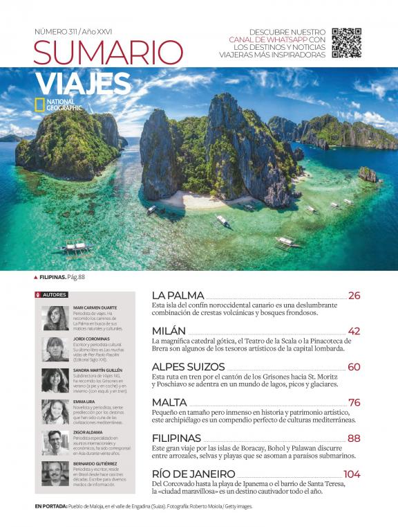 Los reportajes de la revista Viajes National Geographic son el medio idóneo para admirar la belleza del mundo, inspirarse o relajarse con ella, evocar antiguos viajes o plantearse otros nuevos. Con fotografías y textos de calidad excepcional, Viajes National Geographic presenta cada mes rutas por España, Europa y el resto del mundo, escapadas de fin de semana y paseos para conocer lo más atractivo de una ciudad, junto a experiencias en plena naturaleza o para disfrutar del patrimonio cultural.