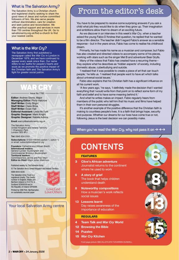 The purpose of The War Cry, the official national publication of The Salvation Army in the United States, is the same as that for which the Army itself was called into being: to communicate the Christian gospel, to bring people to experience Jesus Christ as Savior and inspire them by His example.
