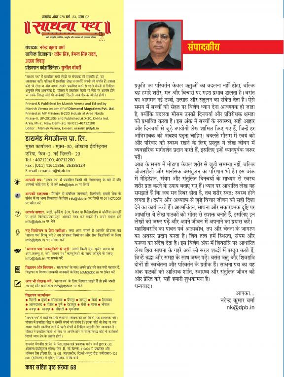 Sadhna Path is a health and wellness magazine which also covers spirituality and ayurveda in collaboration with Sadhna Channel. Sadhna Path is an endeavour taken under the aegis of Diamond magazines, to make discerning and callous people stop aping the West blindly and realise their country's worth. It is a monthly Hindi transformative magazine being published for the last eight years, covering religion, astrology, spirituality, vaastu and Feng Shui. It is a complete magazine for your mind, body and soul.
