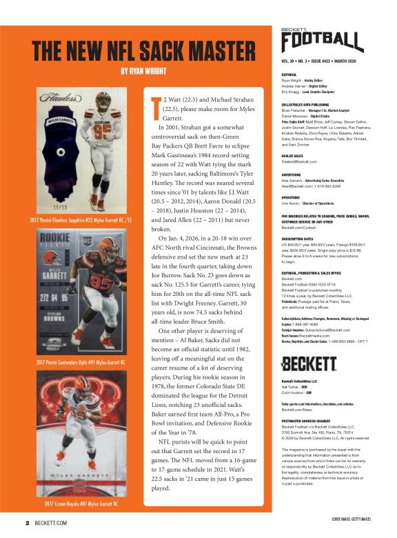 Dive into the exciting world of football collectibles and memorabilia with Beckett Football Magazine. We're thrilled to introduce you to this publication, your go-to source for all things related to football cards, collectibles, and the vibrant hobby of football memorabilia. Beckett Football Magazine, published by Beckett Collectibles LLC, is not just a magazine; it's your comprehensive guide to the world of football collectibles. As you explore the pages of Beckett Football Magazine, you'll find a world of content that caters to football collectors and fans alike: * Price Guides: Access up-to-date price guides for football cards, helping you stay informed about the value of your collectibles. * Card Reviews: Explore in-depth reviews of football cards, including insights into key players, rookie cards, and special editions. * Market Trends: Stay ahead of market trends and discover the latest developments in the football collectibles hobby. * Collector Features: Dive into features on passionate collectors, their prized football memorabilia, and their stories. * Expert Analysis: Benefit from expert analyses and commentary on the football collectibles market and industry. Beckett Football Magazine is your ultimate guide to navigating the world of football collectibles. Subscribe now and stay on top of the latest trends, values, and stories in the exciting hobby of football memorabilia.