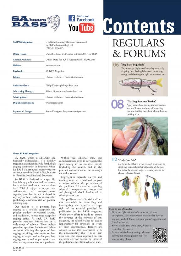 SA BASS, which is editorially and financially independent, is a monthly magazine catering exclusively for the bass angling community in Southern Africa. It is designed as a specialist bass fishing publication and has catered for a well-defined niche market since April 2001. It enjoys the support and endorsement of non-government organisations, but is not affiliated in any way to these bodies or to any other publishing, environmental or political interest group. SA Bass is a specialist publication, providing authoritative editorial exclusively on bass angling and related subjects such as boats, conservation and outdoor recreation vehicles. Articles are compiled by its own staff backed by a team of experienced bass anglers appointed as SA Bass Field Representatives throughout the country and overseas. Our mission is to promote bass angling as a socially acceptable and popular outdoor recreational activity, and in addition, to encourage acceptable angling ethics. As such, SA BASS provides pertinent information on a wide range of subjects. These include providing a platform for informed debate on issues affecting the sport of bass angling, providing information on bass angling strategies and techniques, bass angling waters and opportunities, and also creating awareness of new products. Within this editorial mix, due consideration is given to developing the sport among all the country's people (including the youth), and to the practical conservation of the country's natural resources. SA Bass is a key role player on behalf of bass anglers and the bass industry in negotiations with the Department of Environment Affairs and Tourism regarding regulations of the Biodiversity Act that regulate the presence of Bass in the country. SA Bass is the official organiser and presenter of a monthly bass angling tournament, known as the “Cast-for-Cash” Tournament Trail that provides an opportunity for recreational as well as experienced, top-level bass anglers to compete for prize money and trophies. To maintain and enhance the value of the publication, SA Bass presents its readers with regular reader competitions with prizes provided by many sponsors and advertisers. SA BASS is distributed country-wide to outlets, not only in South Africa, but also in Namibia, Swaziland and Botswana. Copyright is expressly reserved and nothing may be reproduced in part or whole without the permission of the publisher. Website: www.sabass.com.