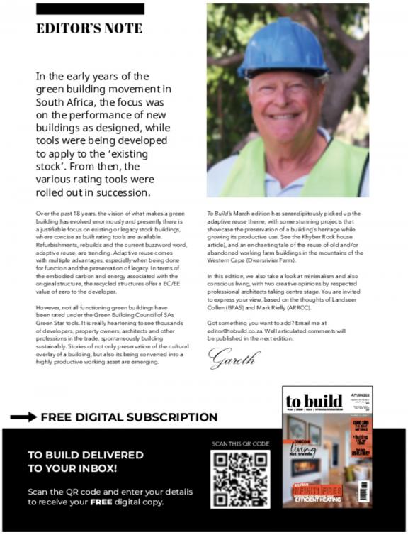 To Build, with its national footprint, is an effective platform to use for building your brand and out-marketing your competition. To Build also caters for consumers directly—our distribution audience is your target audience. The publication focuses on the latest developments, trends and industry news. The editorial is distinctive in the way it conveys information on interior and exterior decor, architectural trends, and the latest building technologies and developments throughout South Africa.