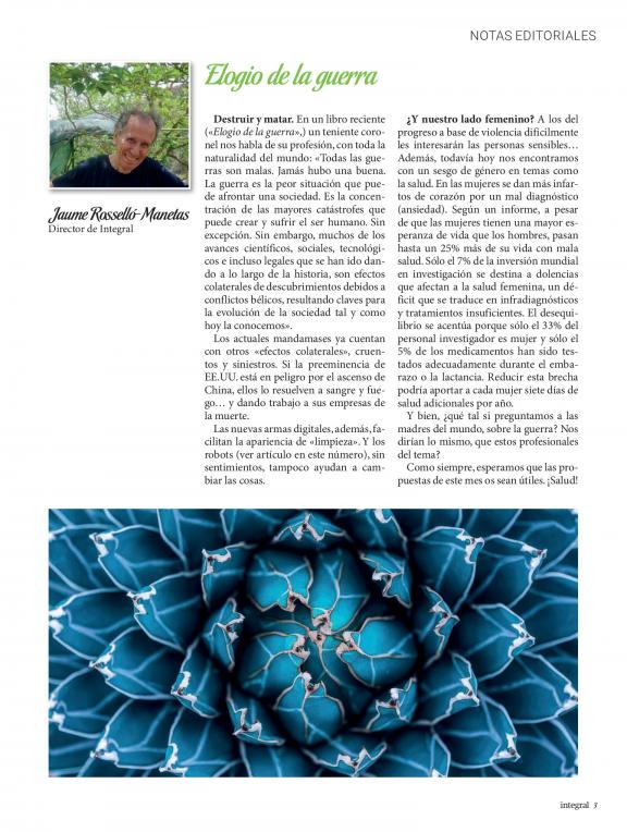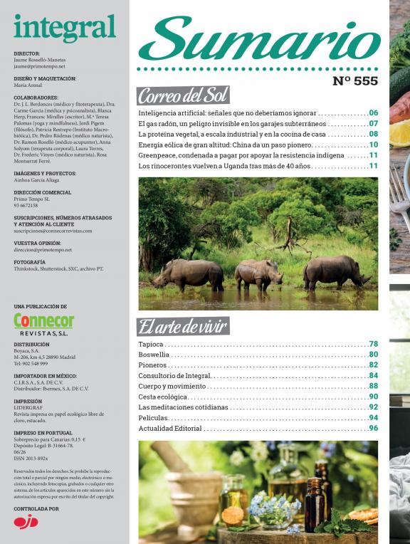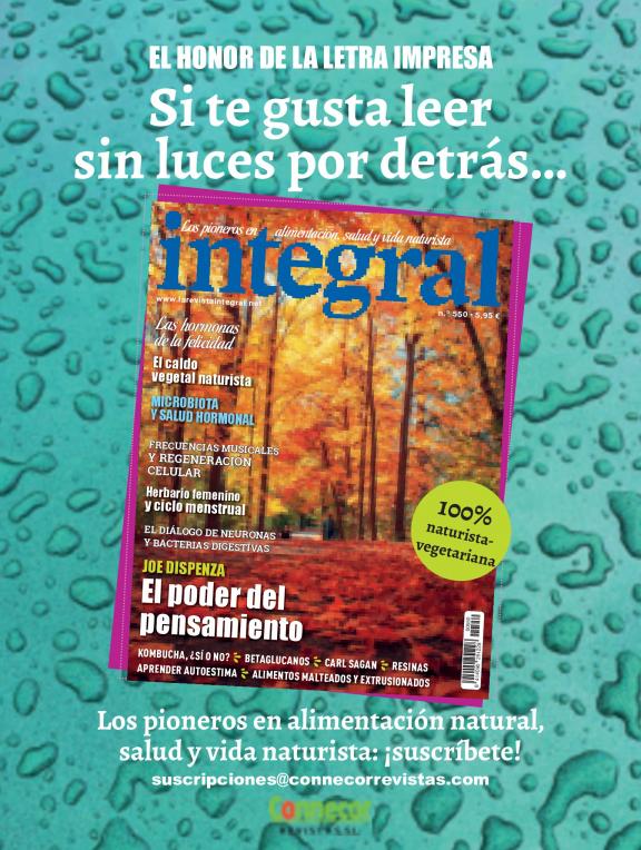 Es una revista para los que no sólo quieren una vida mejor sino también un mundo mejor. Profundiza en temas de ecologismo, salud y alimentación natural, salud ambiental, medio ambiente, naturaleza, hogar y hábitos saludables, solidaridad y formas de vida alternativas y sostenibles. Con 30 años de historia, INTEGRAL cuenta con colaboradores de renombre, como Manuel Rivas, Vandana Shiva, Juan López de Uralde, Joaquín Araújo, Wangari Maathai o Jorge Riechmann, y expertos en el campo de la salud y las terapias naturales. Cada mes leen INTEGRAL más 150.000 lectores, porque cada vez son más los que saben que todo lo que le ocurre al planeta repercute directamente en las personas.