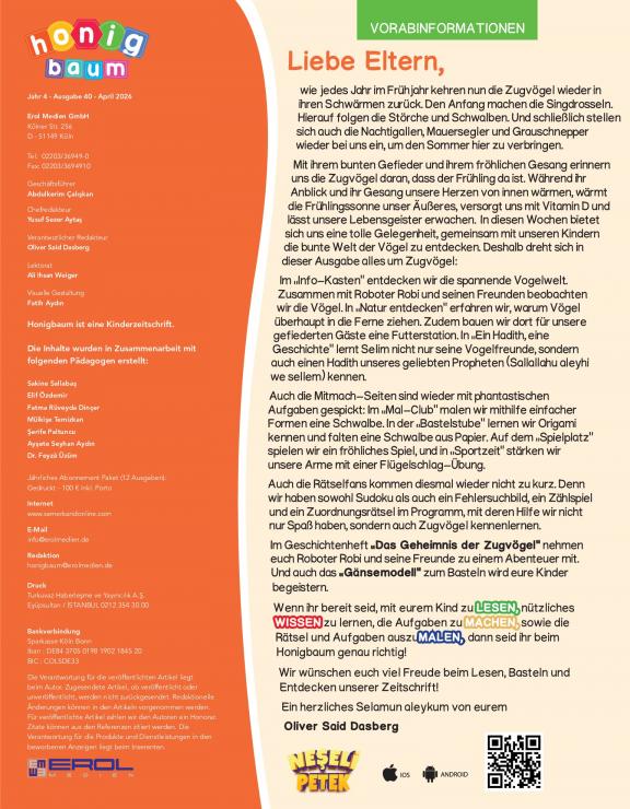 Liebe Eltern Wenn ihr bereit seid, mit eurem Kind zu LESEN, nützliches WISSEN zu lernen, die Aufgaben zu MACHEN, sowie die Rätsel und Aufgaben auszuMALEN,, dann seid ihr beim Honigbaum genau richtig! Wir wünschen euch viel Freude mit unserer Zeitschrift! Ein herzliches Selamun aleykum von eurem Oliver Said Dasberg